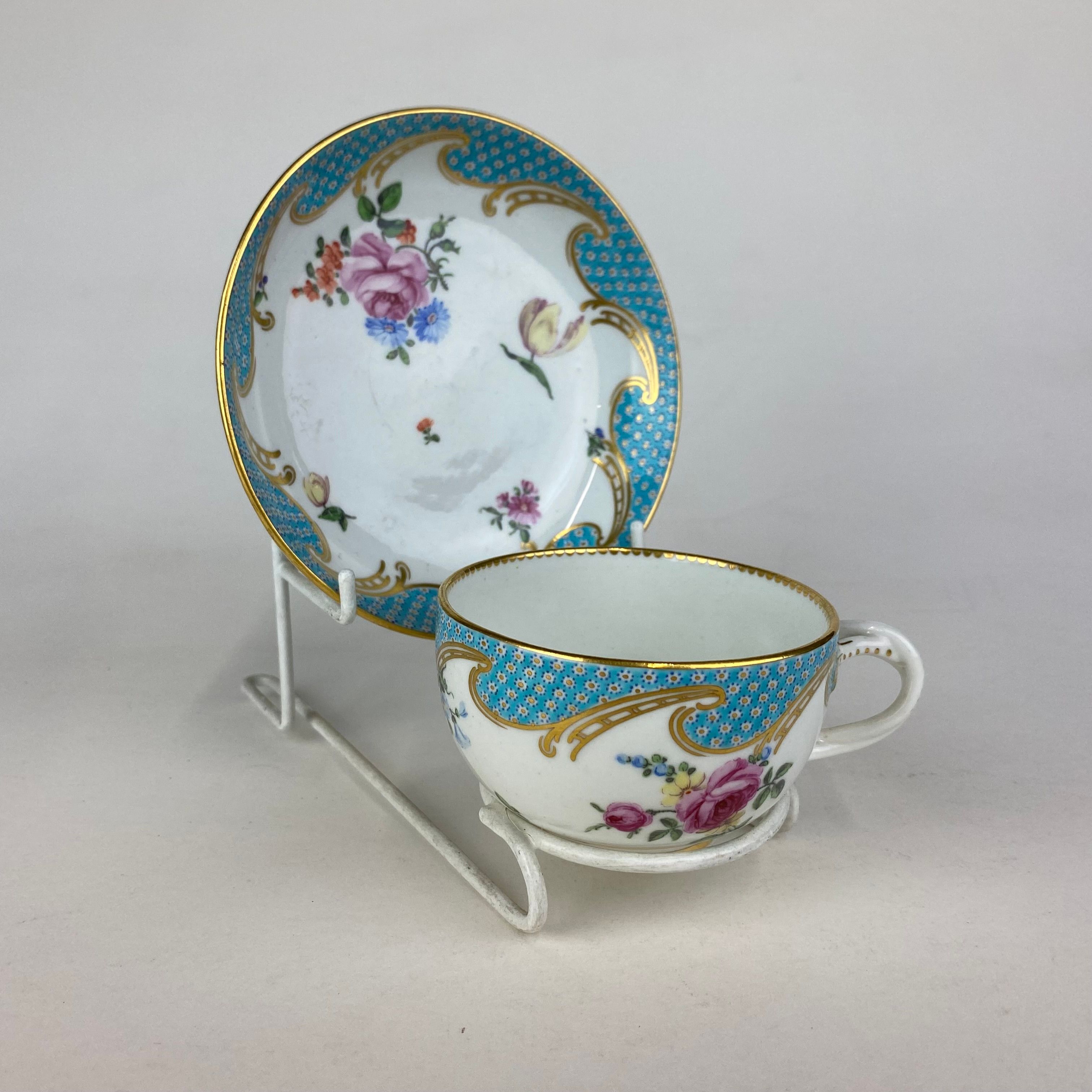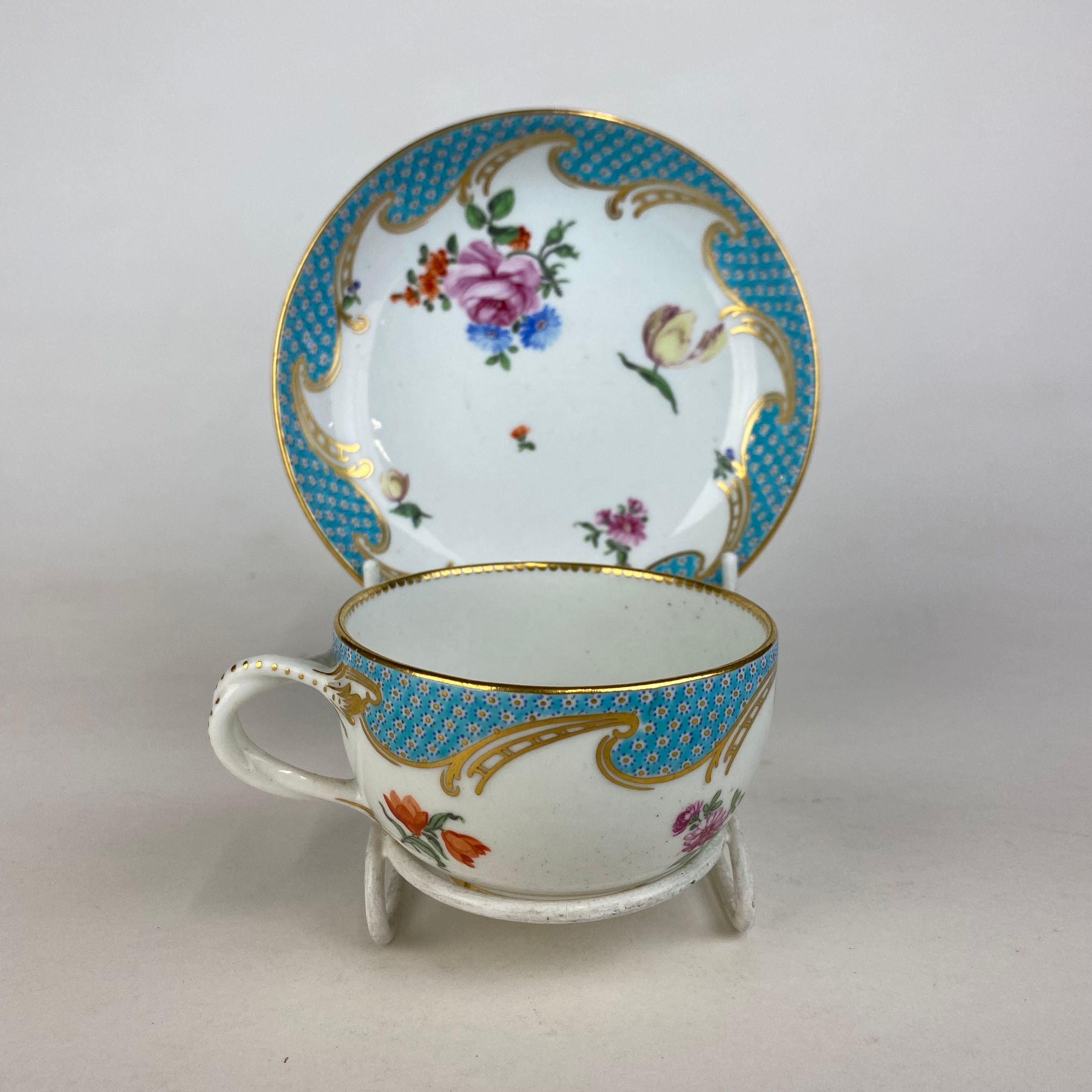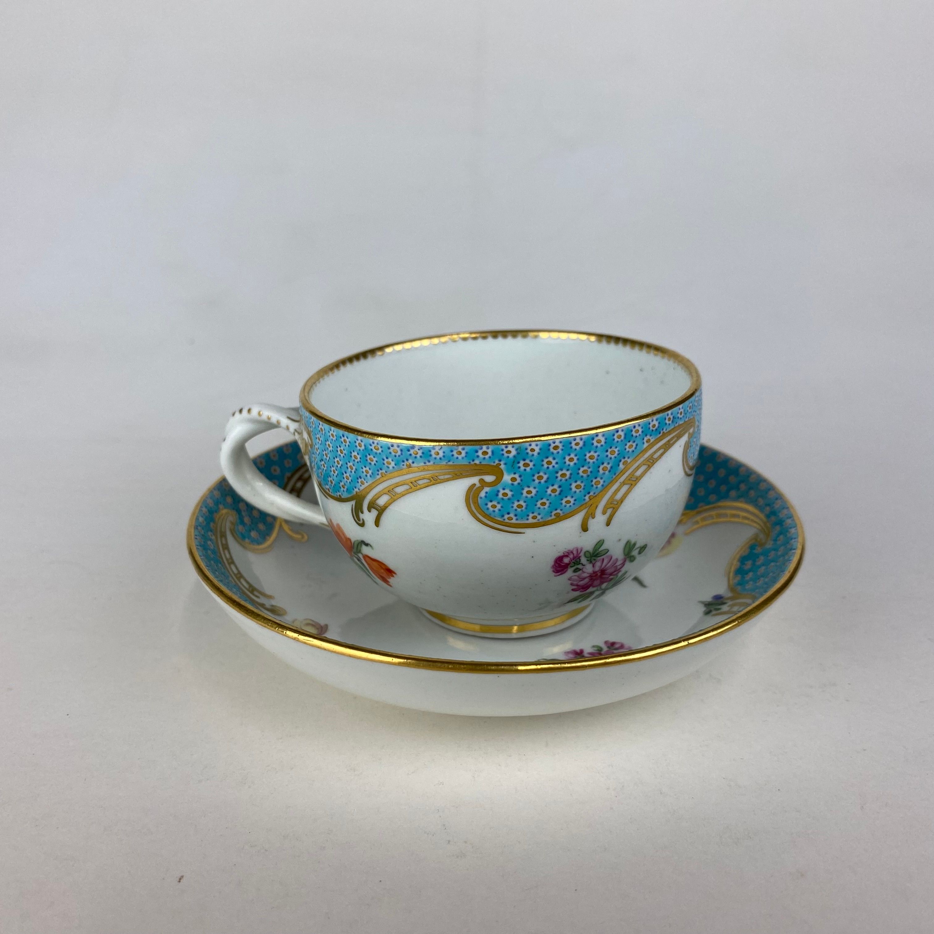 Duesbury Derby Porcelain cup & saucer , circa 1765. Decorated in the Serves style with sprays and bouquets of European flowersand a turquoise dotted border with trellis gilding. The cup with twisted loop handle.