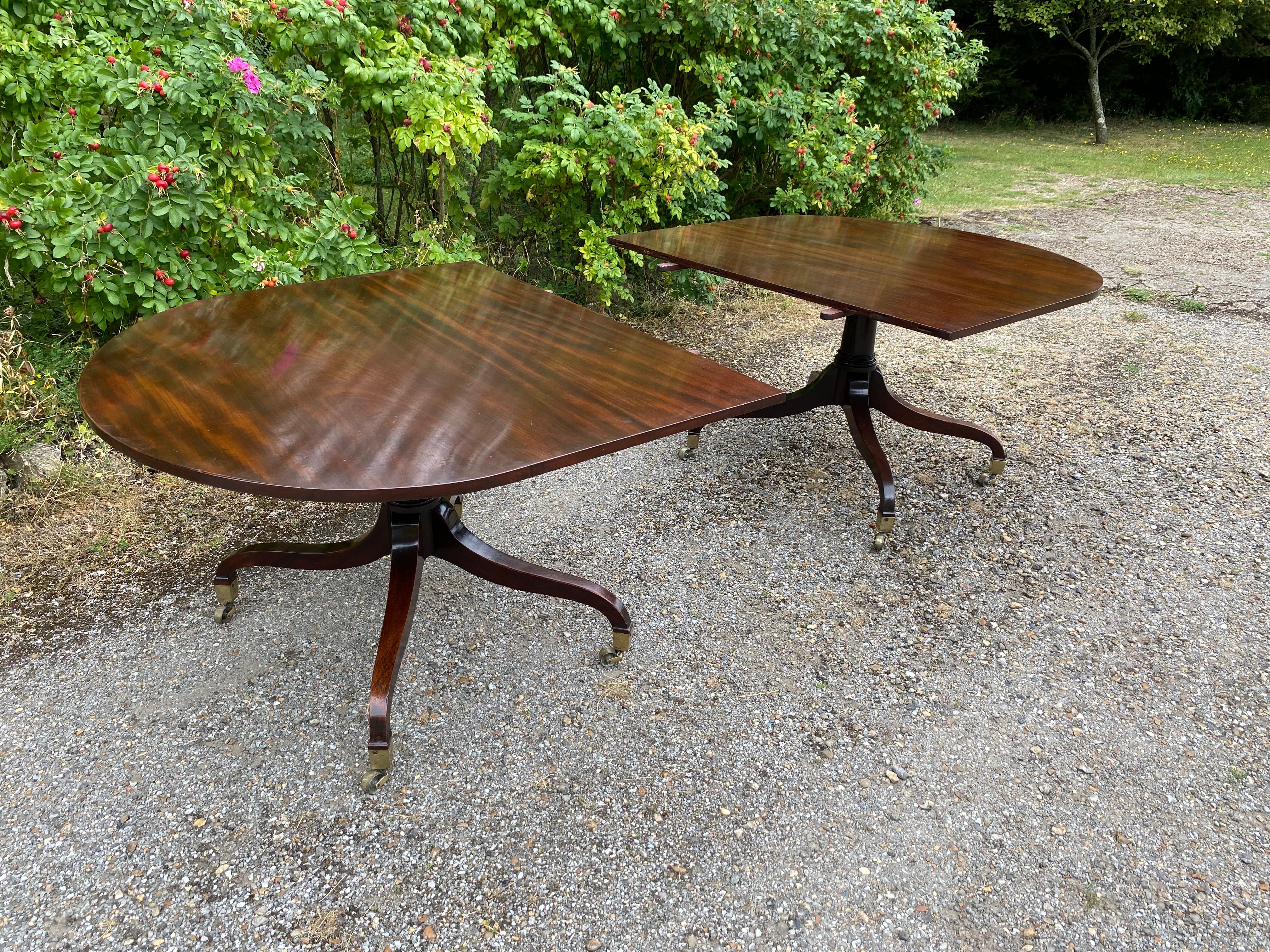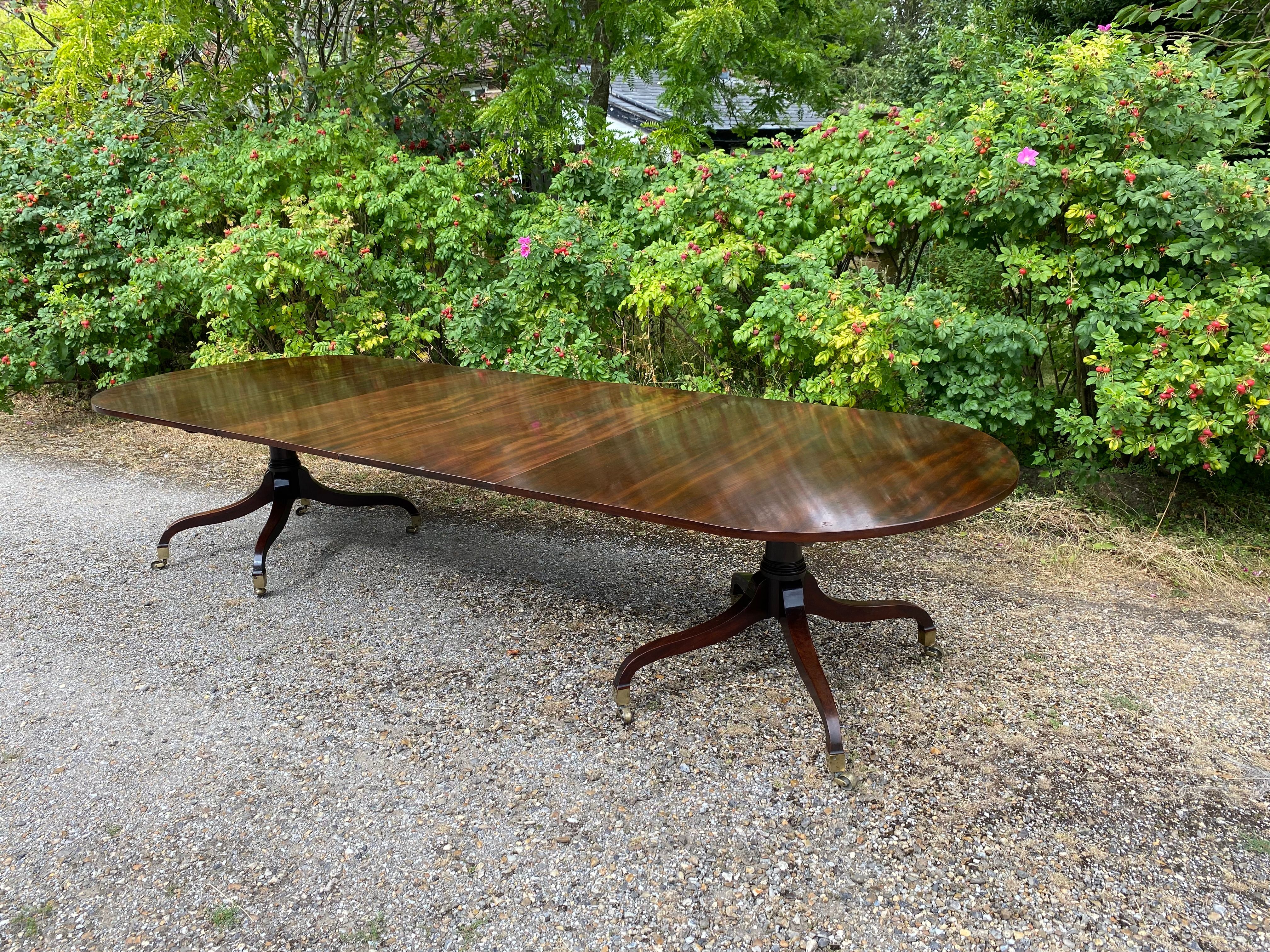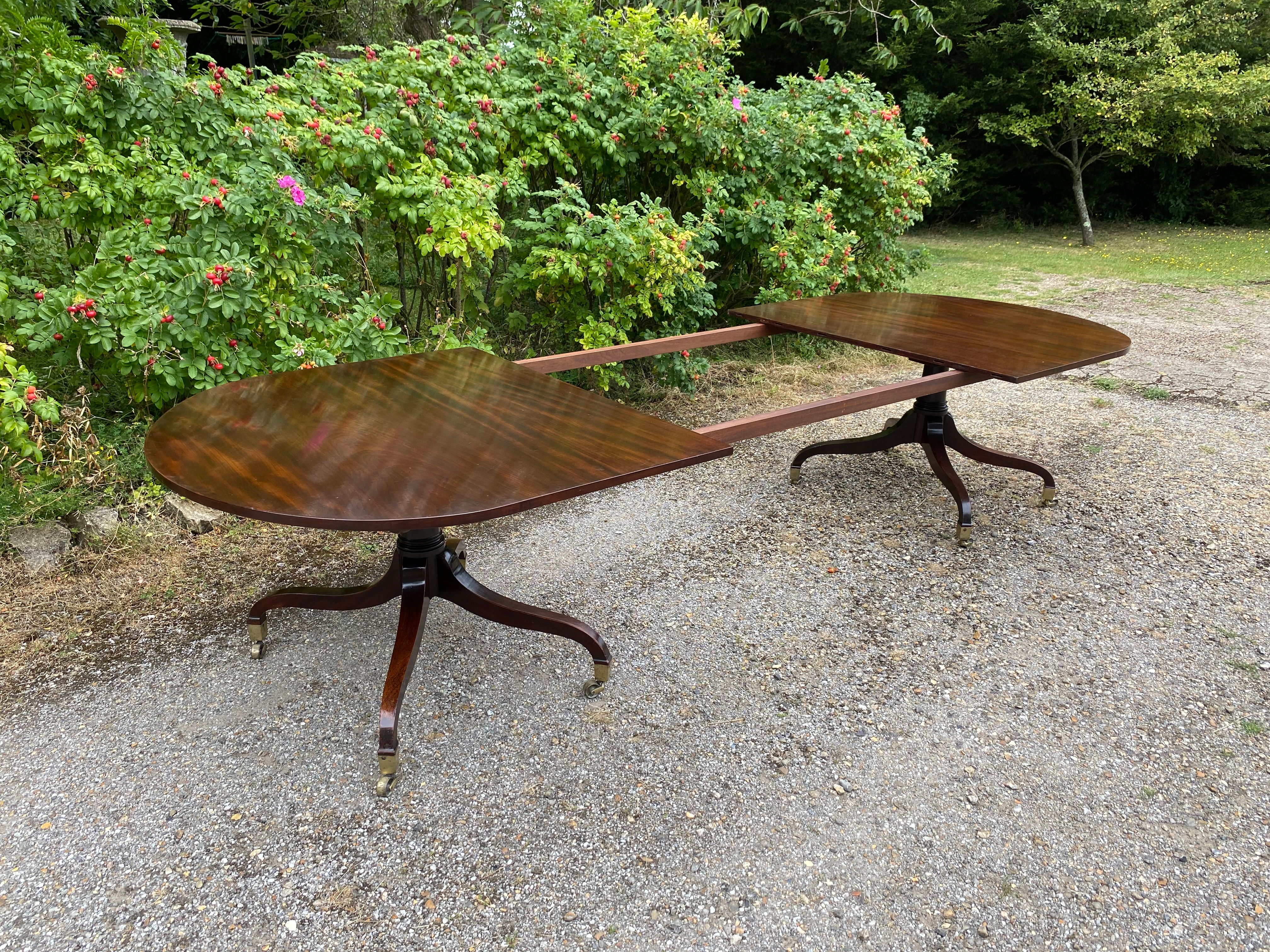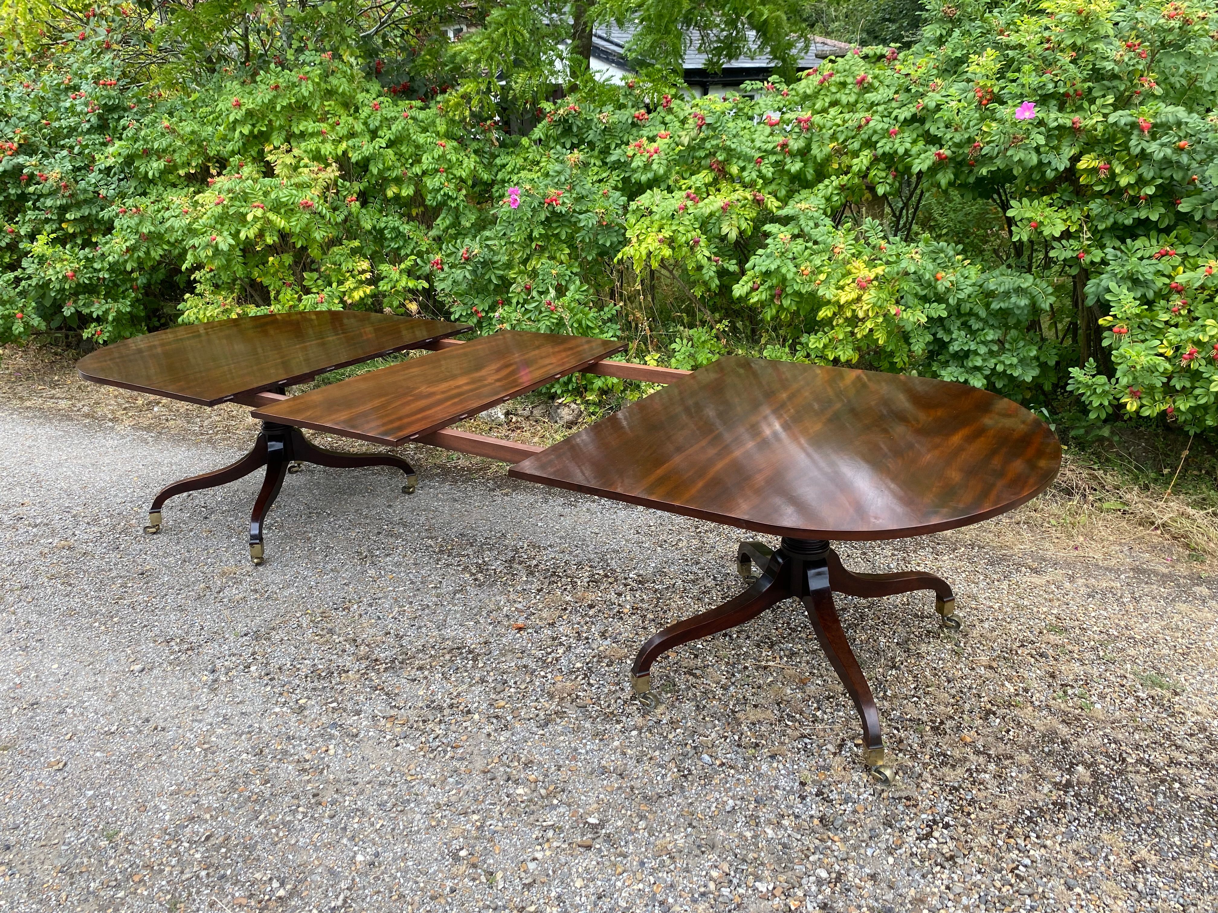 A superior quality George III period figured mahogany twin pedestal dining table constructed in the finest timber. The top consisting of two sections with rounded ends standing on the original 'umbrella' shaped four splay bases with gun-barrel columns and original square brass capped toes and castors. The two removable leaves are re-used leaves from a table of similar date.