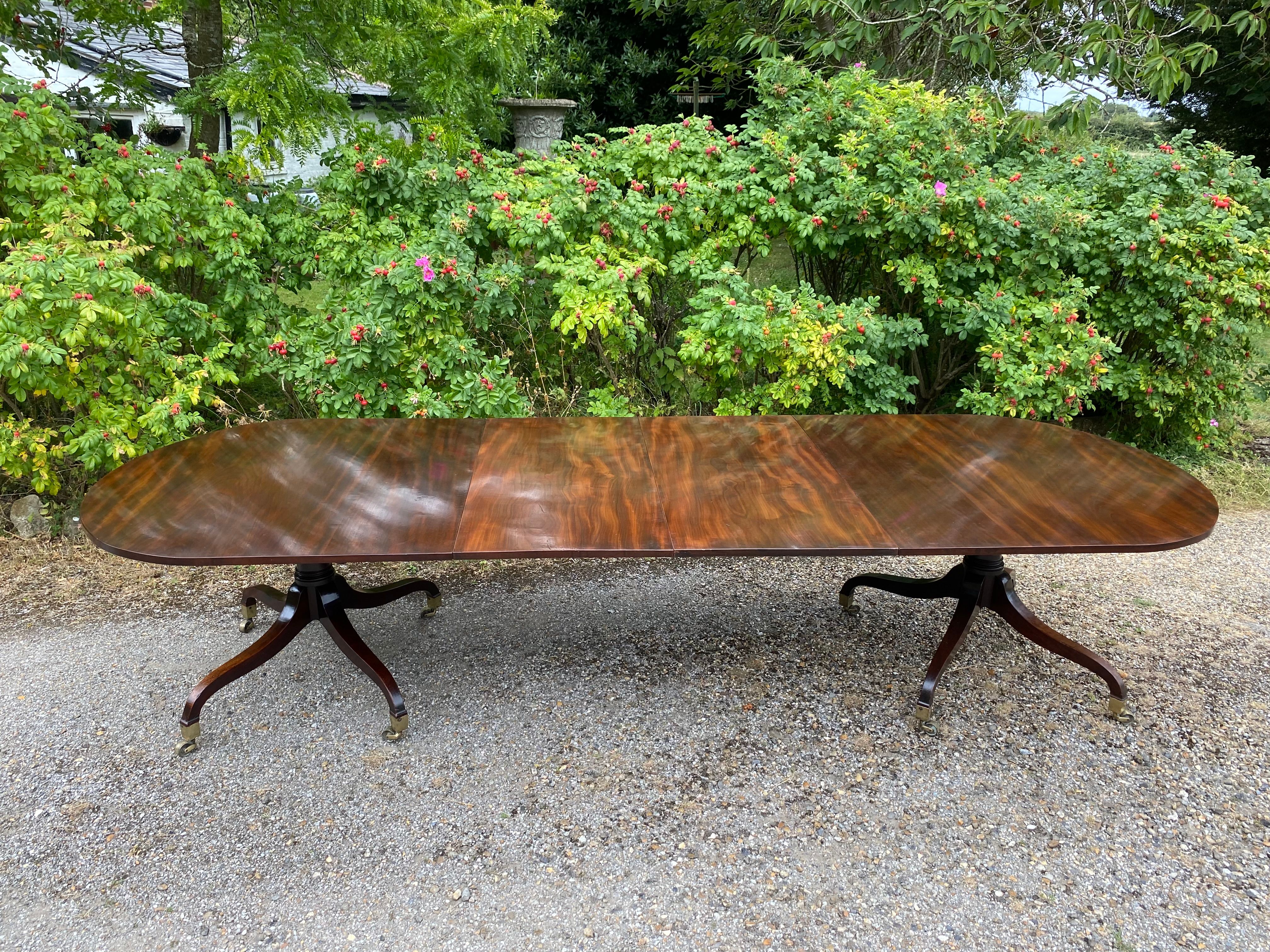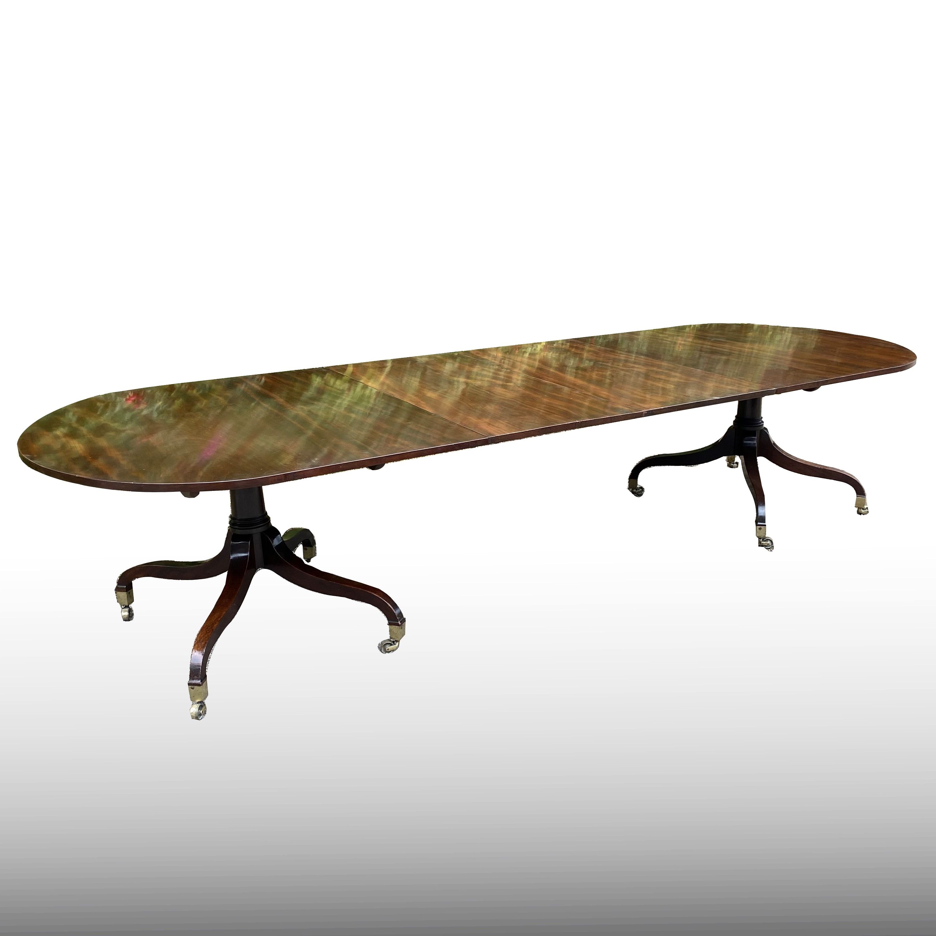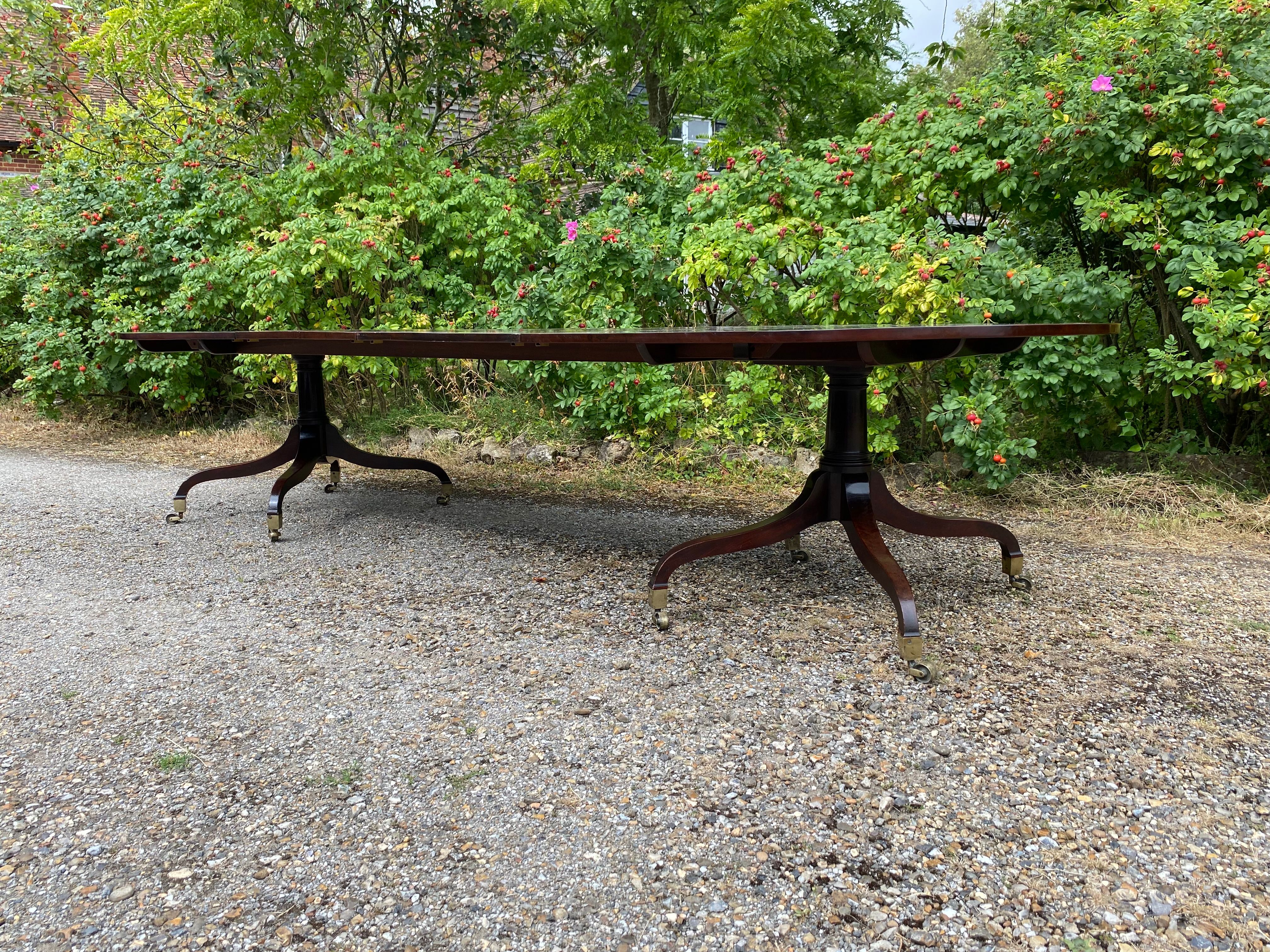 A superior quality George III period figured mahogany twin pedestal dining table constructed in the finest timber. The top consisting of two sections with rounded ends standing on the original 'umbrella' shaped four splay bases with gun-barrel columns and original square brass capped toes and castors. The two removable leaves are re-used leaves from a table of similar date.