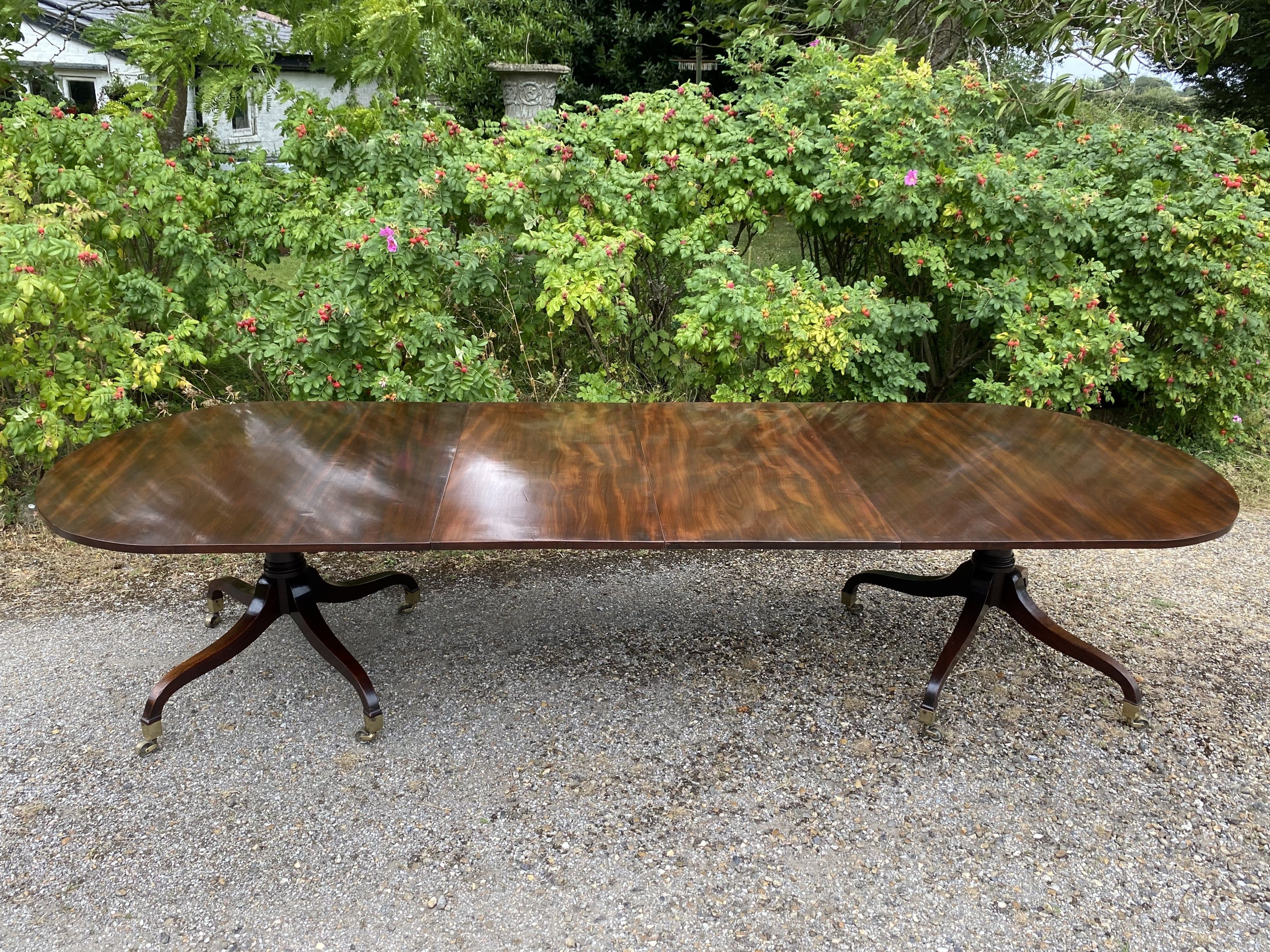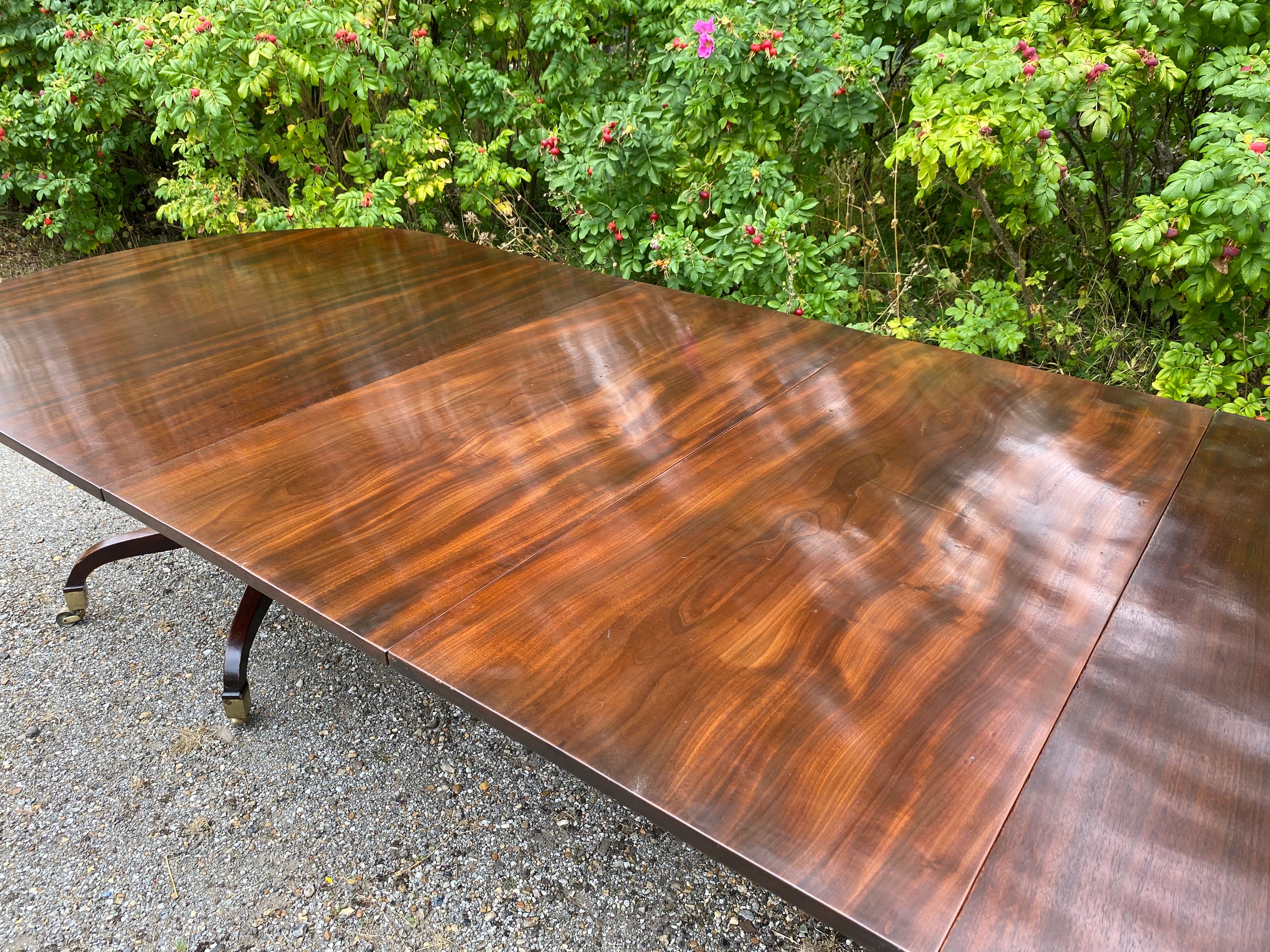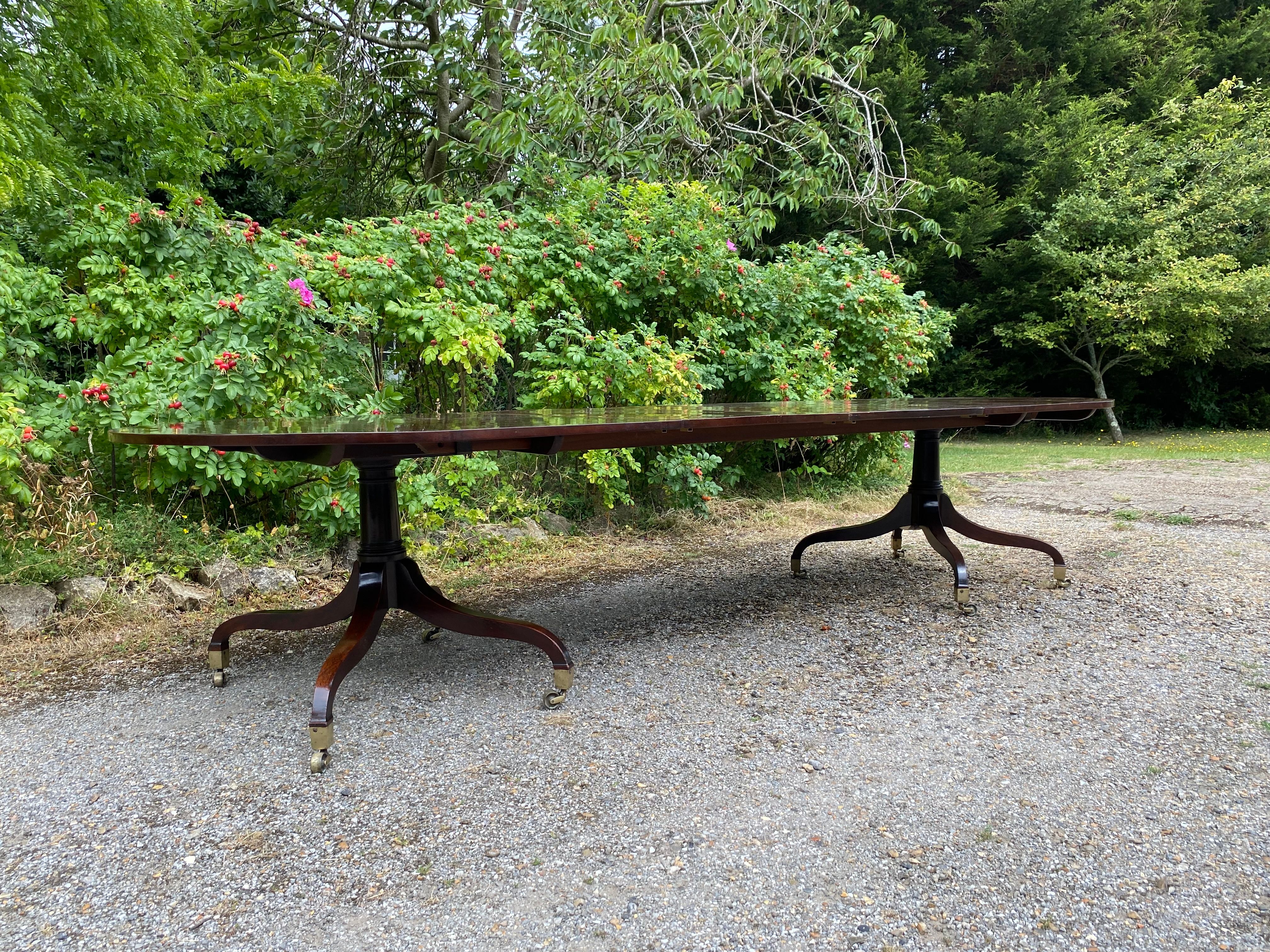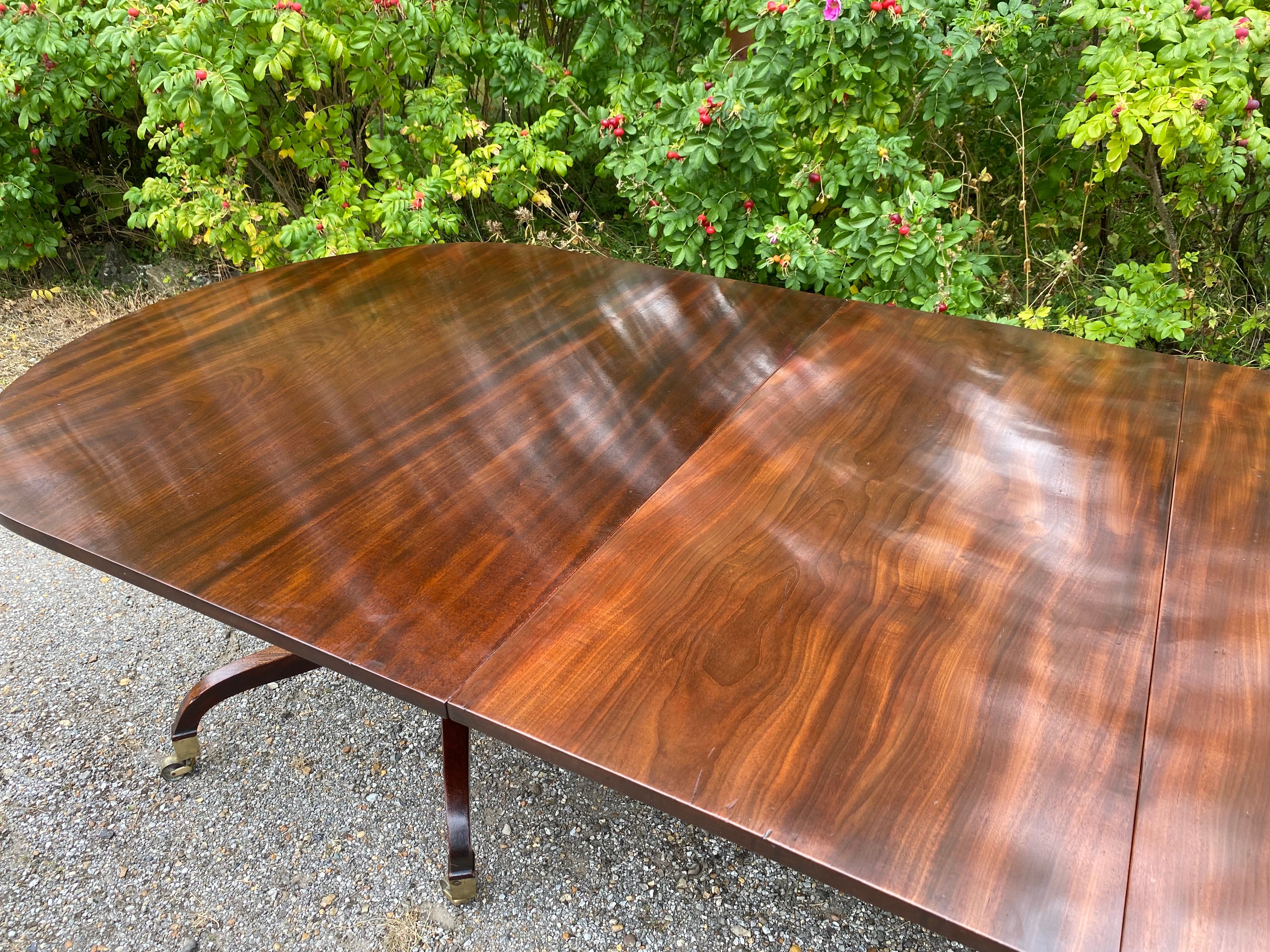 A superior quality George III period figured mahogany twin pedestal dining table constructed in the finest timber. The top consisting of two sections with rounded ends standing on the original 'umbrella' shaped four splay bases with gun-barrel columns and original square brass capped toes and castors. The two removable leaves are re-used leaves from a table of similar date.