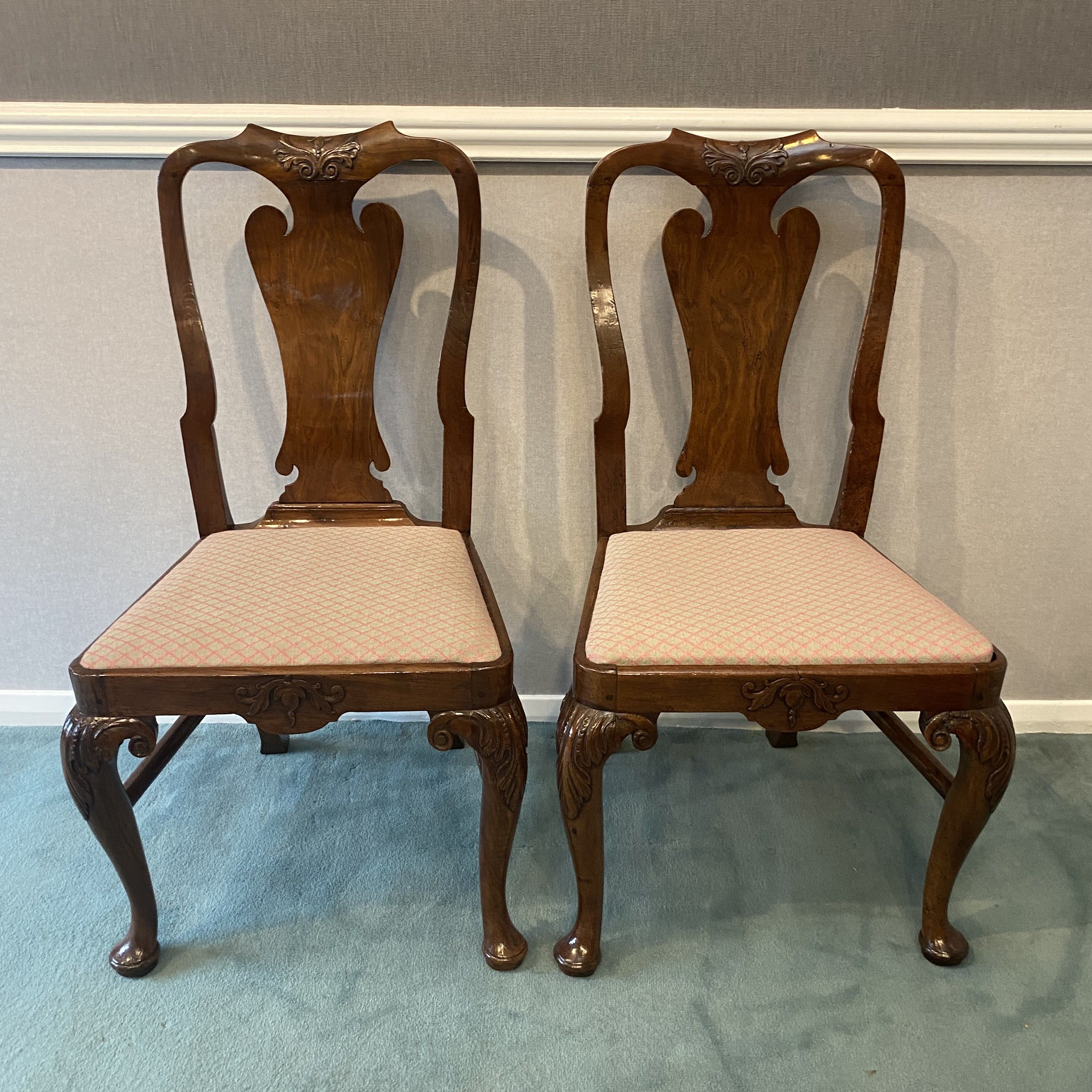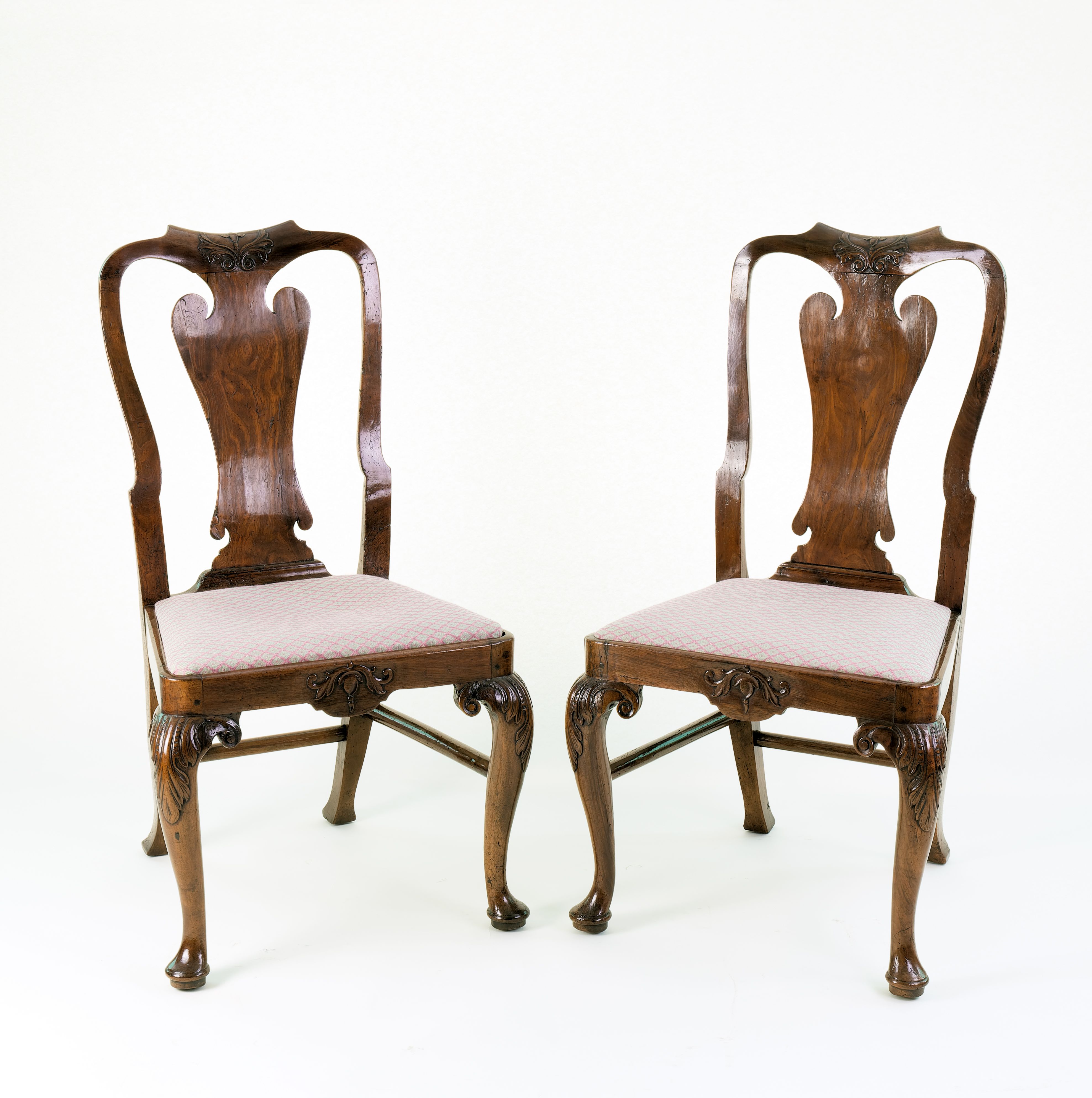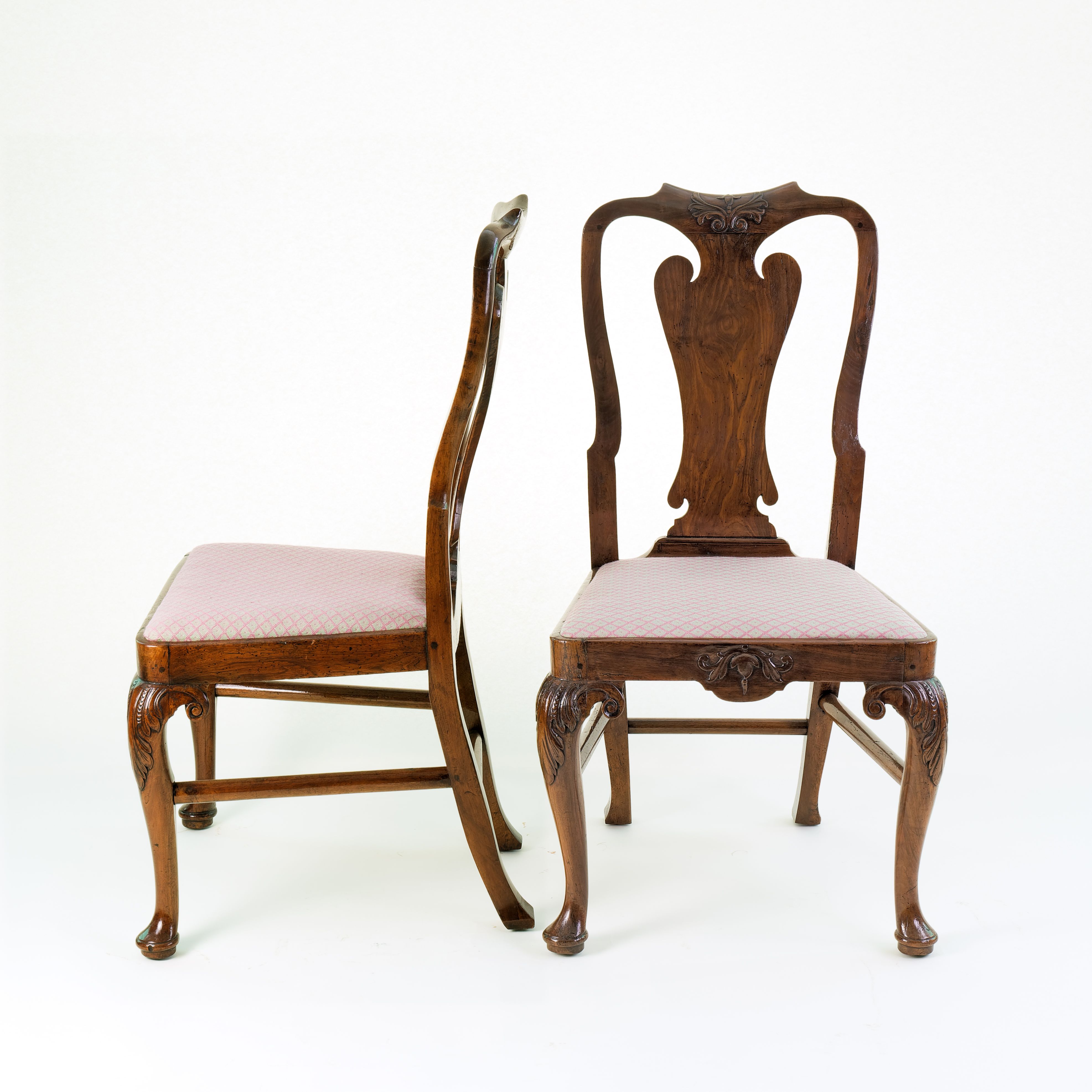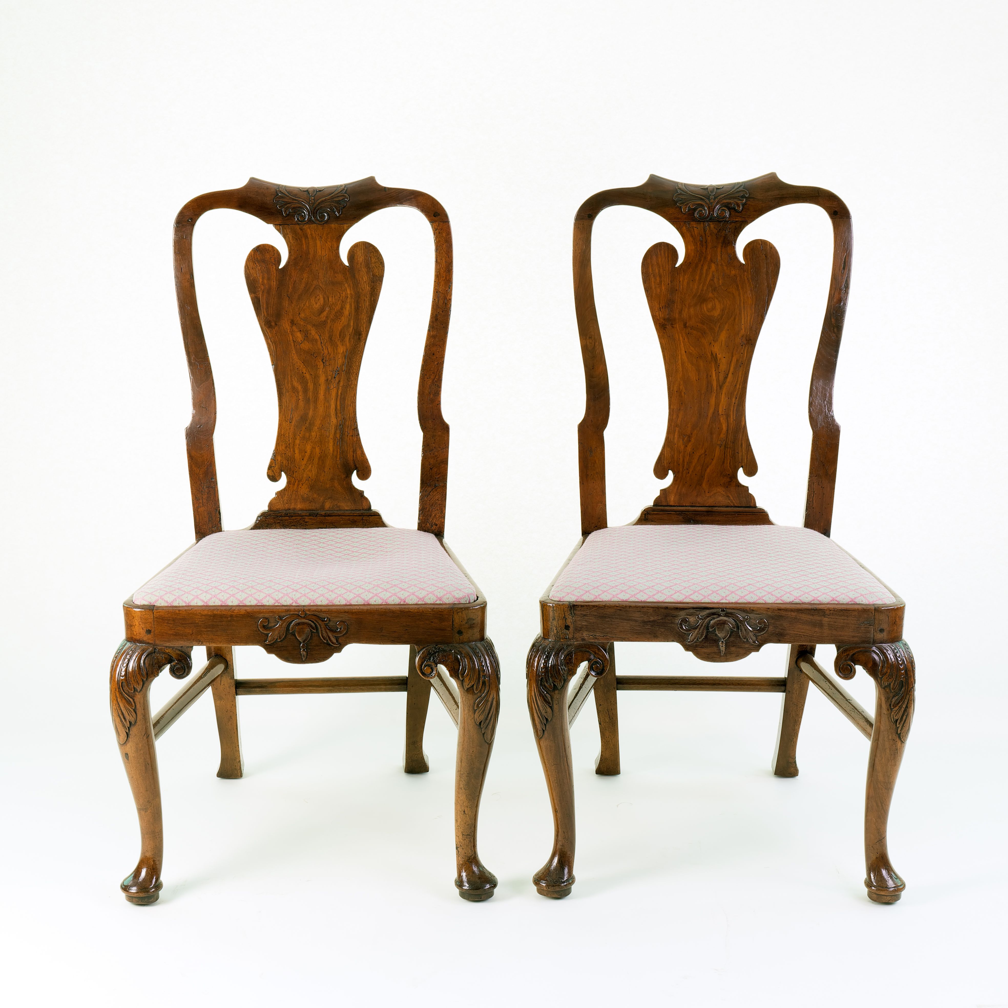 A good pair of early 18th century walnut chairs with figured back-splats and carved decoration to the top and seat rails acanthus knees to the cabriole legs with pad feet and joined by turned stretchers.