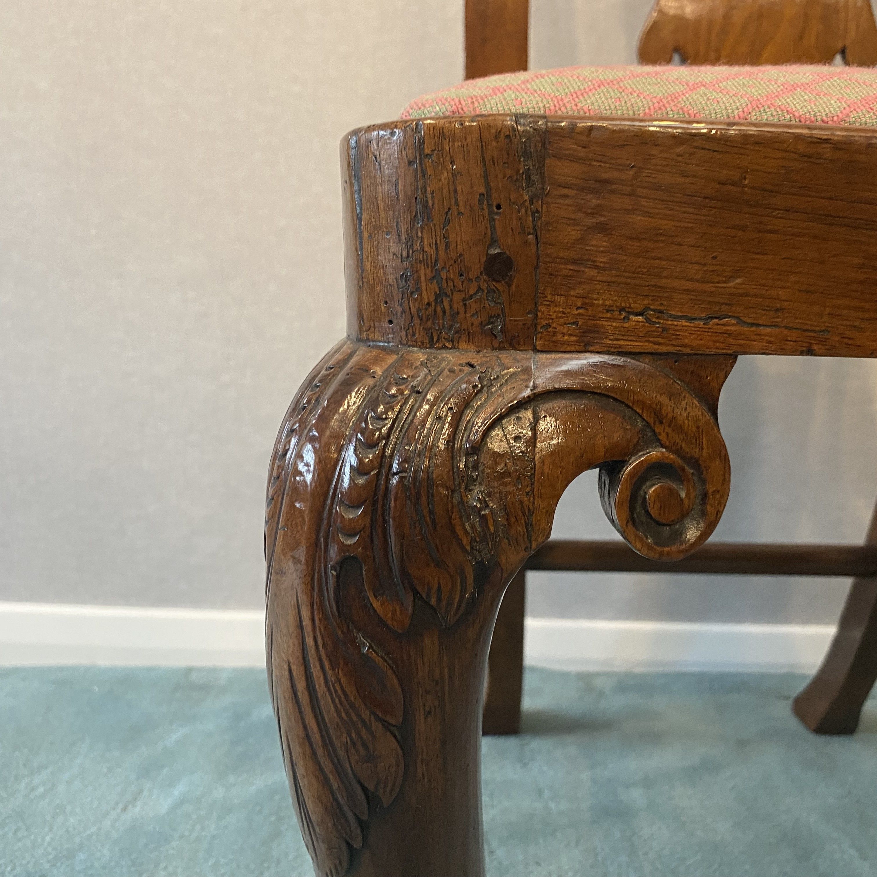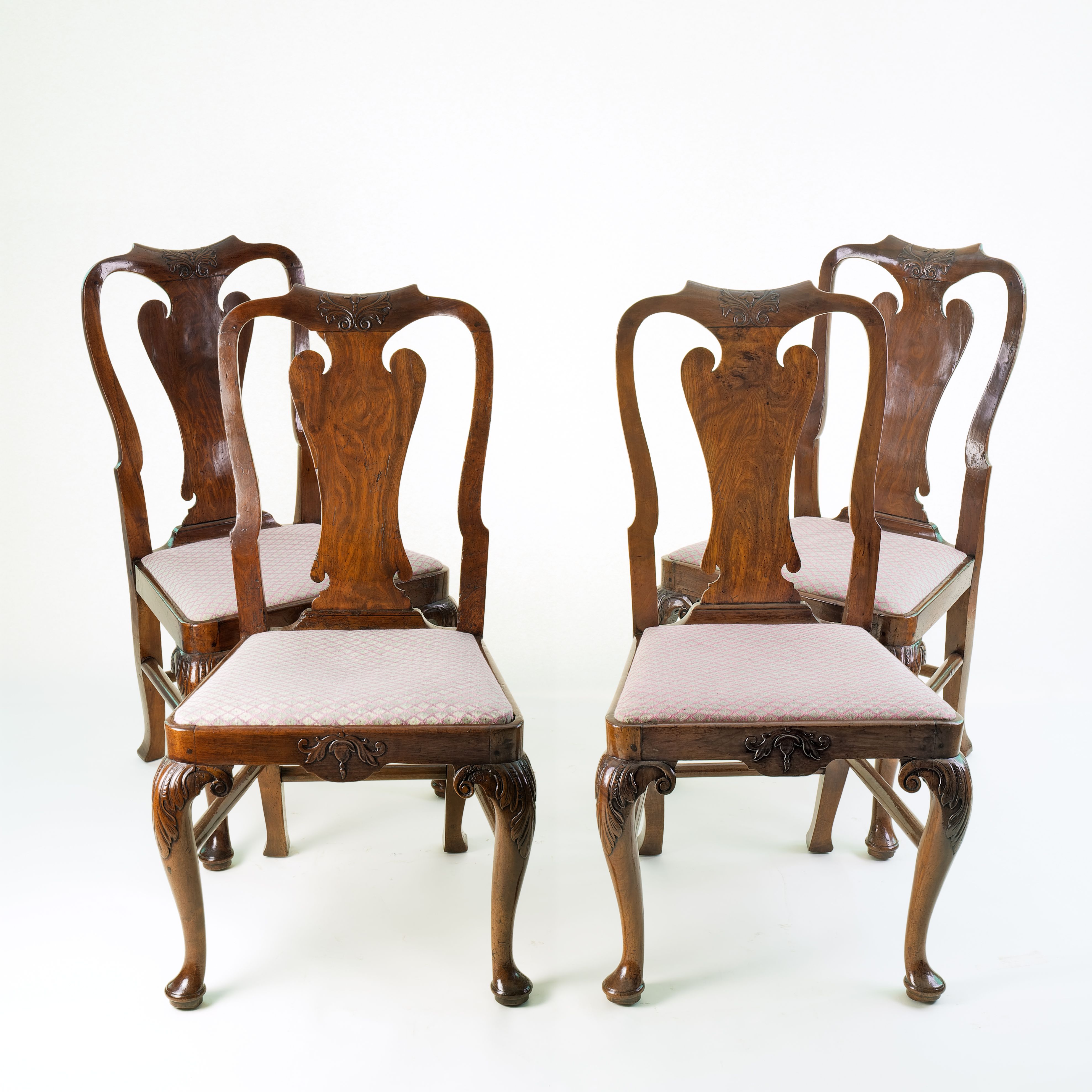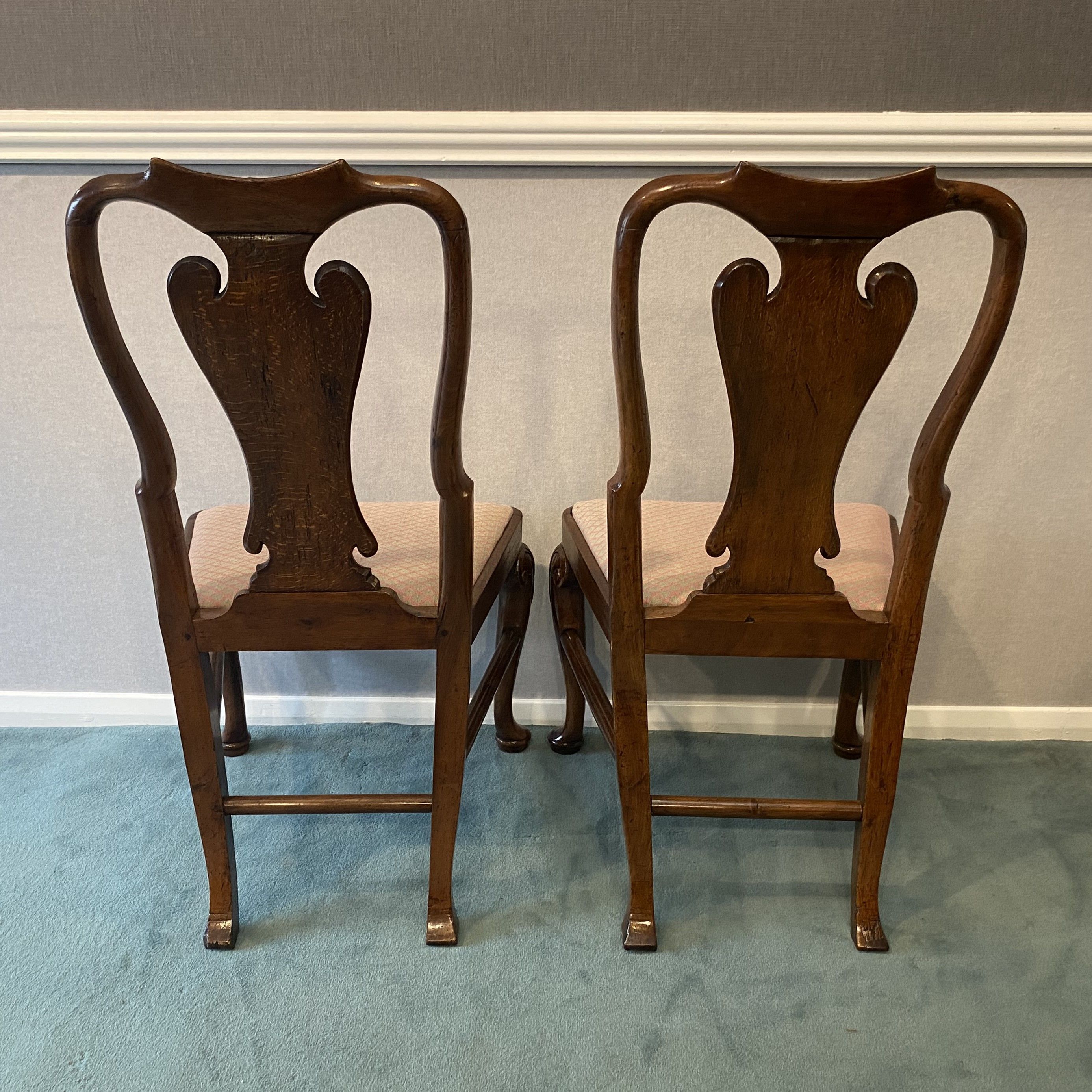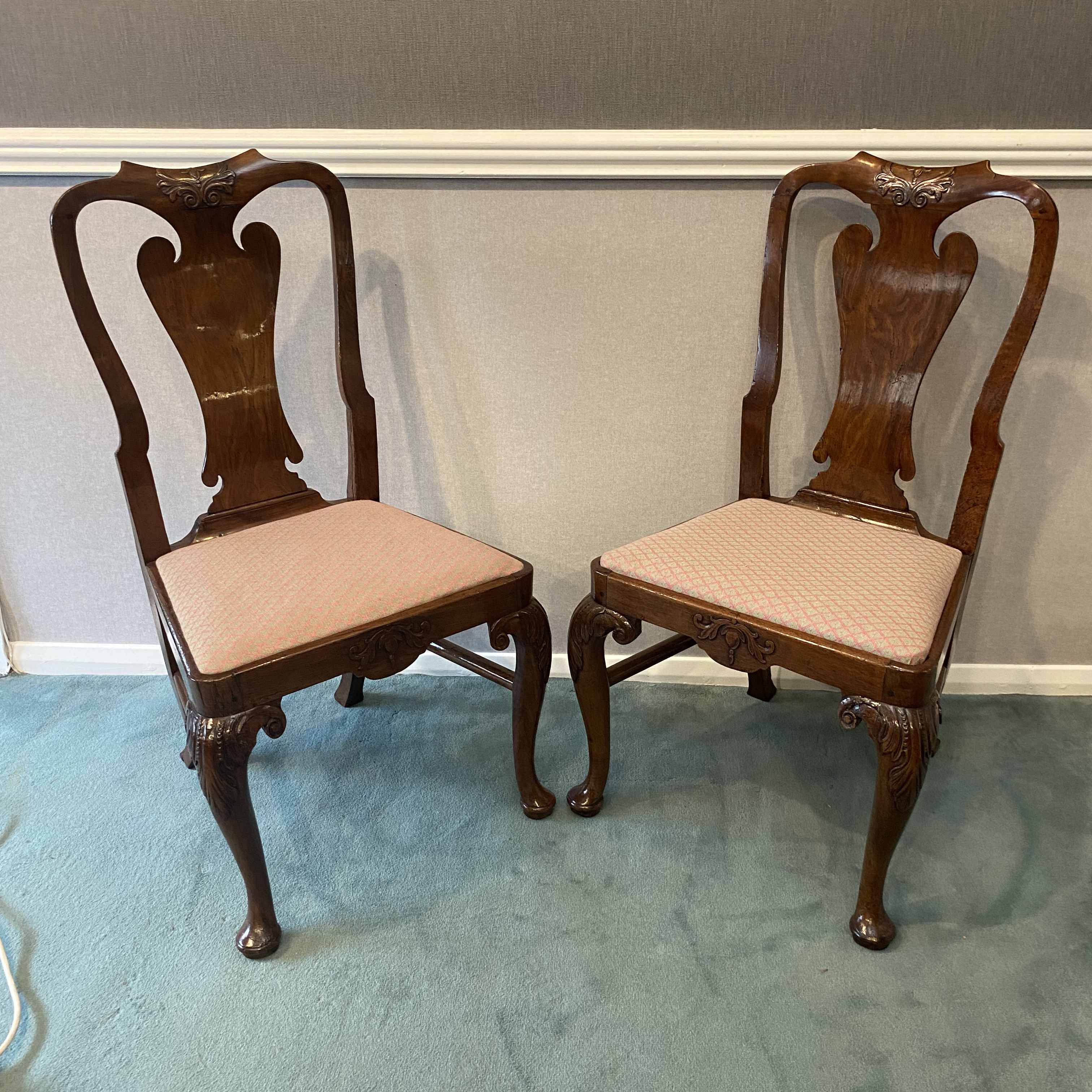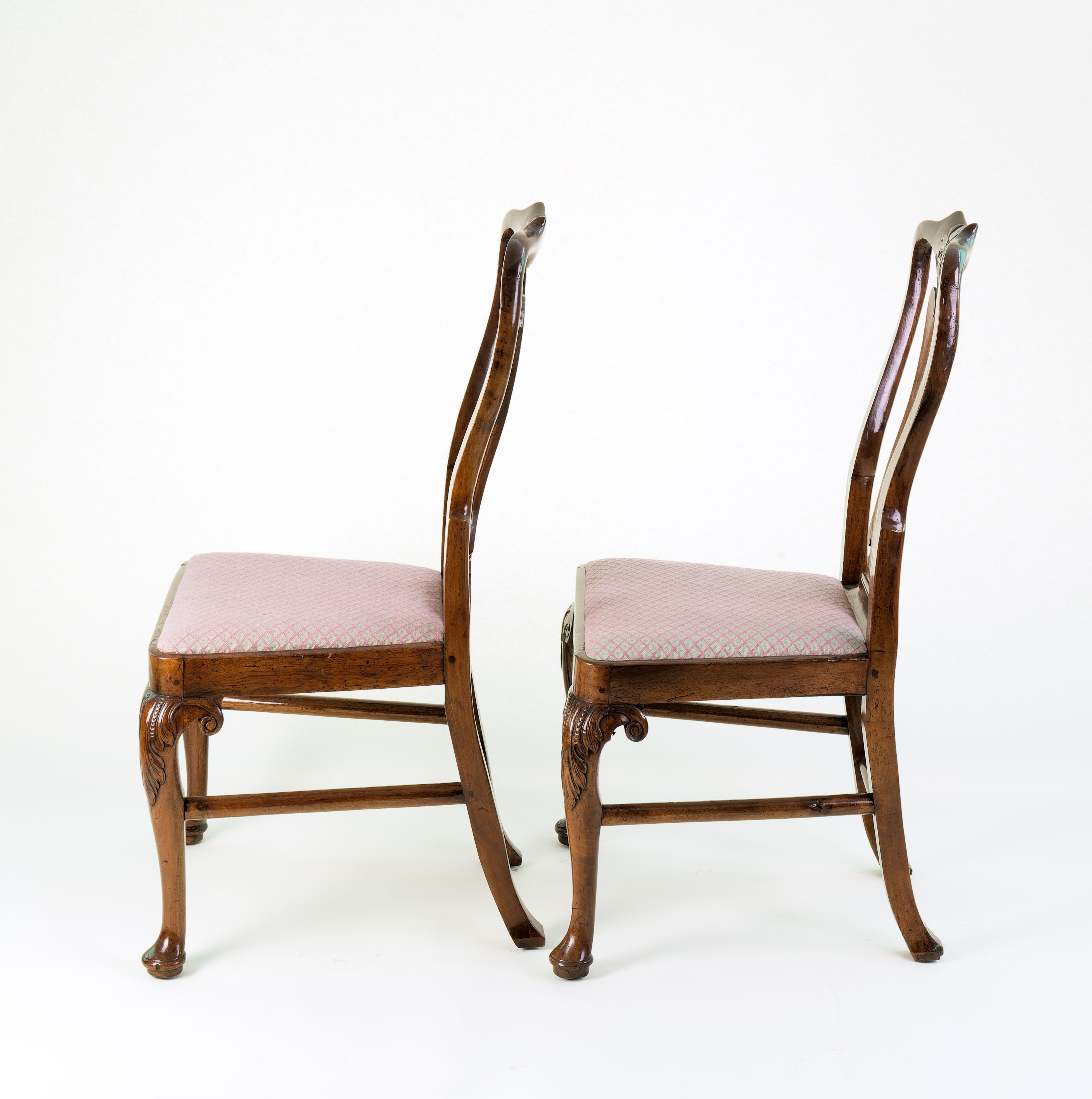 A good pair of early 18th century walnut chairs with figured back-splats and carved decoration to the top and seat rails acanthus knees to the cabriole legs with pad feet and joined by turned stretchers.