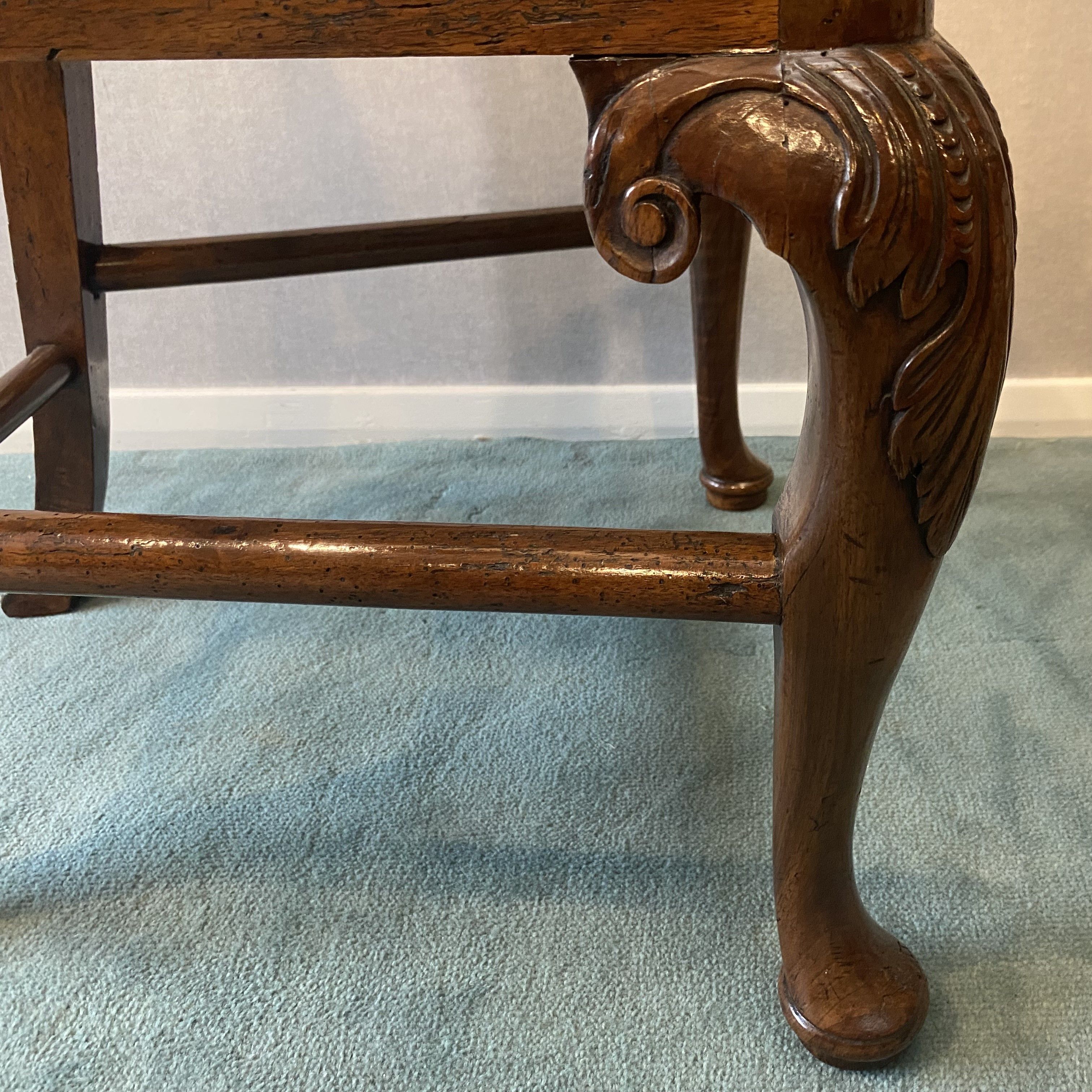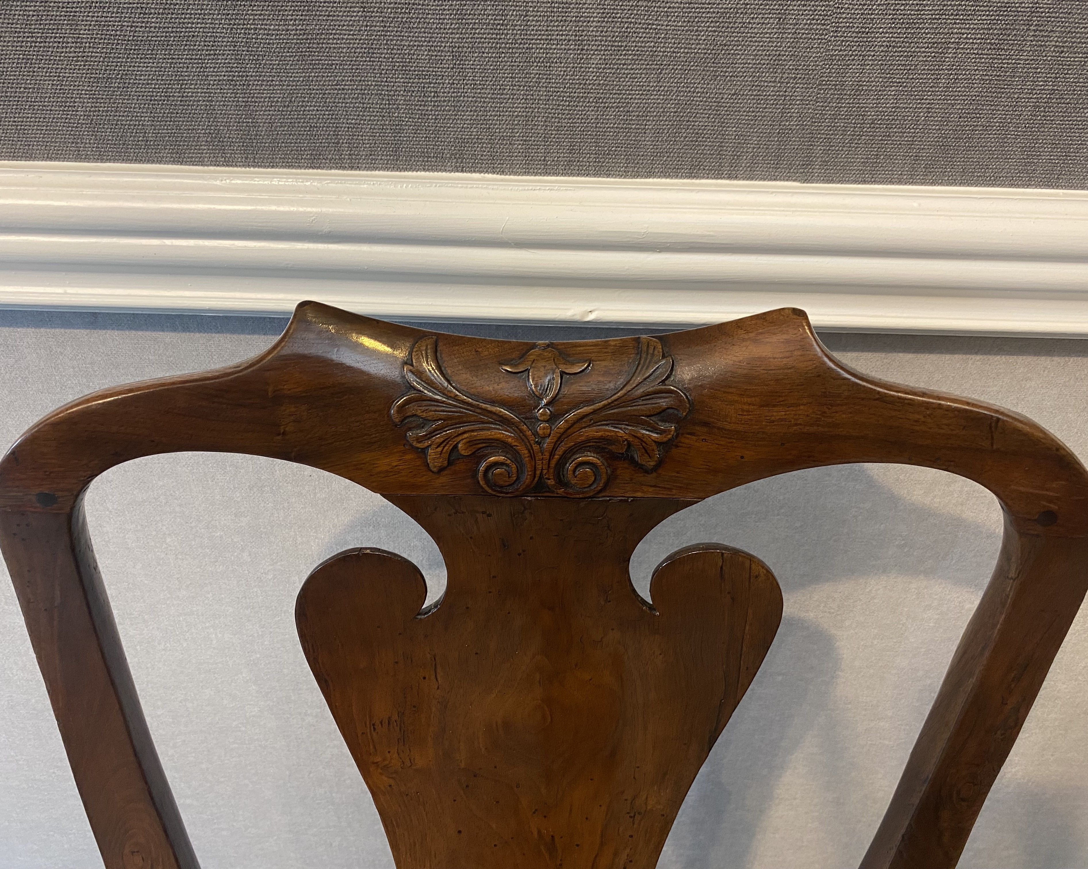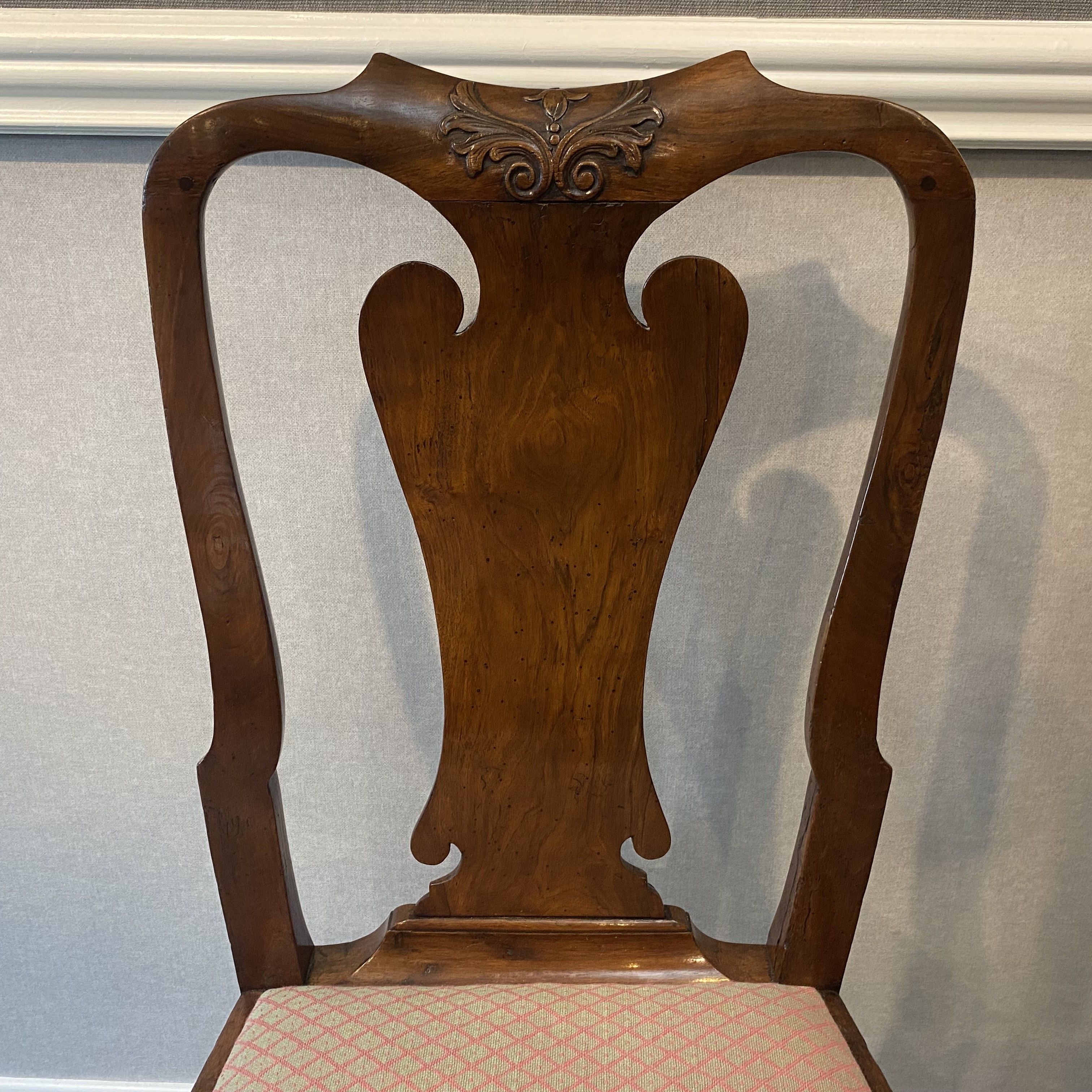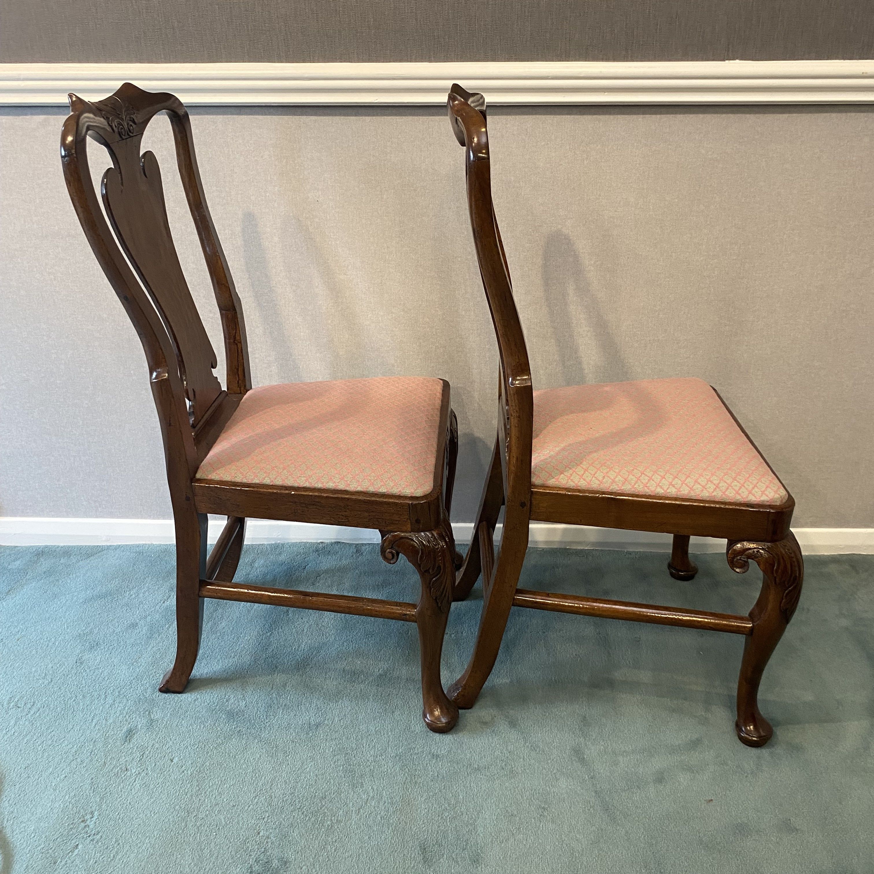 A good pair of early 18th century walnut chairs with figured back-splats and carved decoration to the top and seat rails acanthus knees to the cabriole legs with pad feet and joined by turned stretchers.