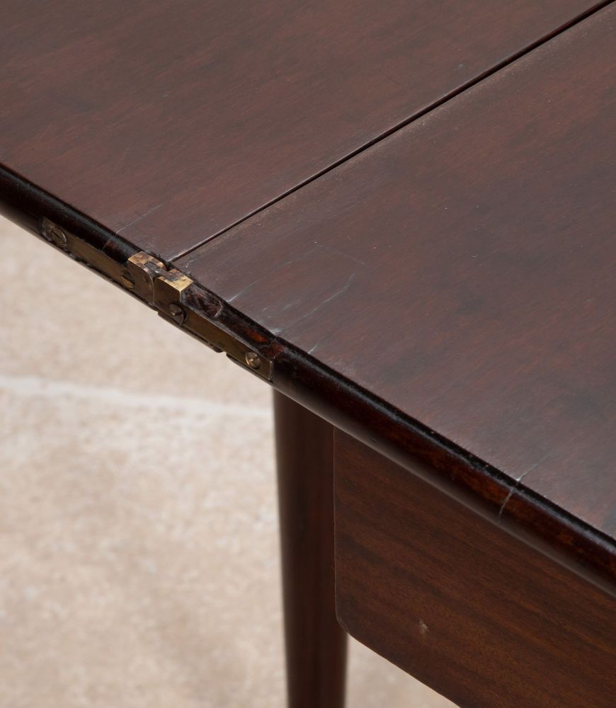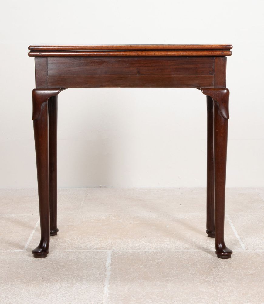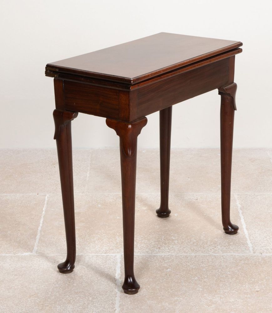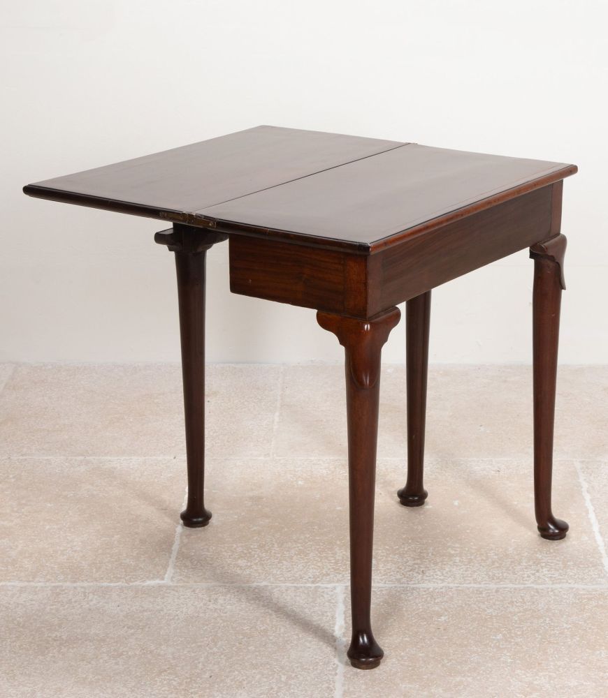 The fold-over top opening to reveal a double sized polished top. Standing on turned tapering legs with lappeted knees and pad feet.